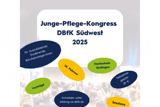 Vorträge, Sessions zu Themen wie KI oder Nachhaltigkeit, mitdiskutieren und Auszubildende aus anderen Einrichtungen kennenlernen – das alles erwartet dich beim Junge-Pflege-Kongress des DBfK Südwest in Esslingen. Viele Auszubildende kommen mit der ganzen Klasse. Den Kongress müsst ihr nicht in eurer Freizeit besuchen, er gilt als berufspolitischer Unterricht – sprecht eure Lehrer:innen an.